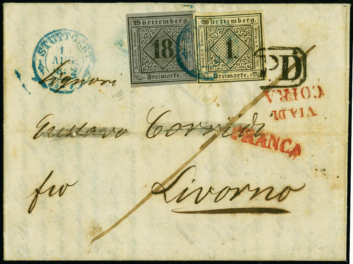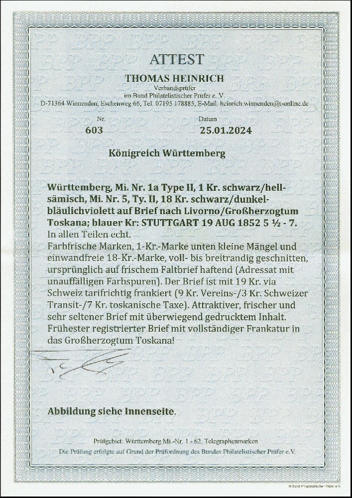 | Zusatzinformationen und Suchstichworte: | 383. Auktion Heinrich Köhler 14.–15. & 18.–23. März 2024 Los 4125 Altdeutschland Württemberg 18 Kr. auf bläulichviolett, voll- bis breitrandig, zusammen mit 1 Kr. auf hellsämisch (unten kleiner Mangel) mit blauem DKr. "STUTTGART 19 AUG 1852" auf komplettem Faltbrief (Adressat mit unauffälligen Farbspuren) über die Schweiz mit vorderseitigem roten "VIA DI COIRA", nach Livorno im Großherzogtum Toskana. Ursprüngliche und sonst einwandfreie Erhaltung. Dies ist der früheste registrierte Brief mit vollständiger Frankatur in das Großherzogtum. Fotoattest Heinrich BPP (2024) Ausruf 1.000,00 EUR |