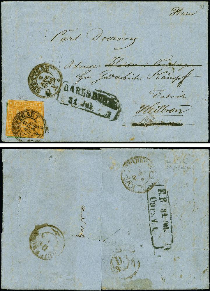 | Zusatzinformationen und Suchstichworte: | 383. Auktion Heinrich Köhler 14.–15. & 18.–23. März 2024 Los 4130 Altdeutschland Württemberg 1857, 3 Kr. orange, farbfrisch mit DKr. "STUTTGART 2.AUG.1858" als Weiterleitungs-Frankatur nach Heilbronn auf kpl. Faltbrief von "CARLSRUHE 31.Jul." mit Baden 3 Kr. grün mit Nummer "24" unter der Württemberg-Marke verklebt mit Ankunftsstempel. Die Marke ist etwas angelöst und dort mit geringer Wellung, sonst in einwandfreier Erhaltung. Eine dekorative und in dieser Form sehr seltene Weiterleitungs-Frankatur, Fotobefund Heinrich BPP (2023) Ausruf 1.000,00 EUR |