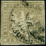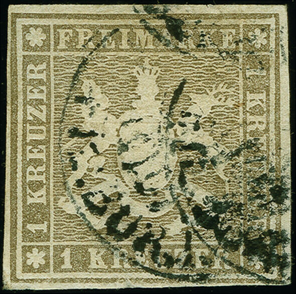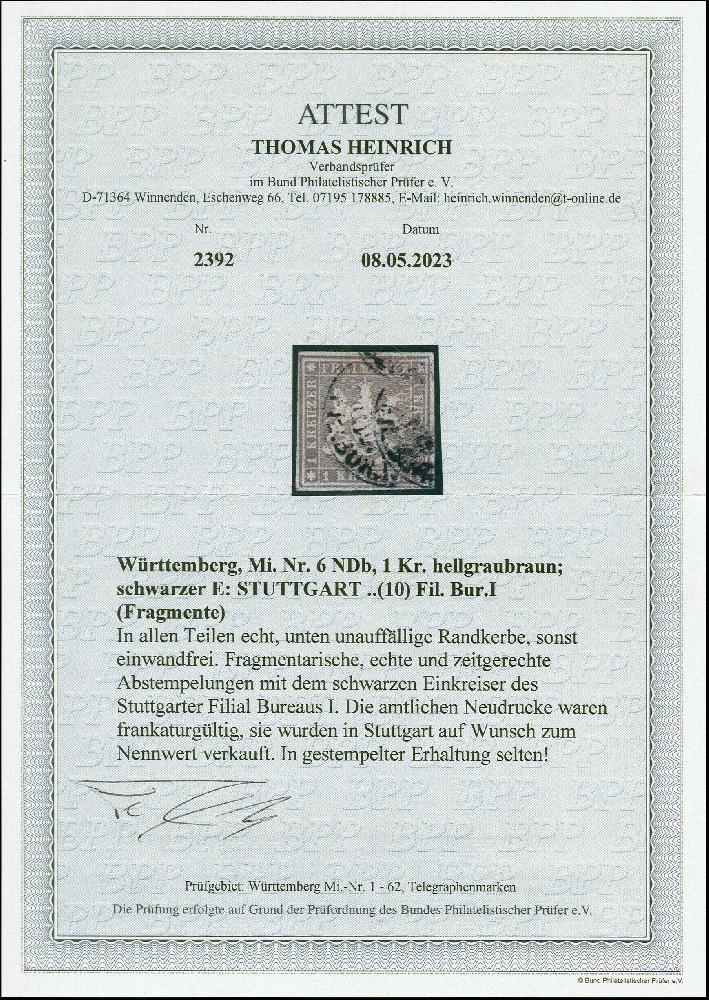 | Zusatzinformationen und Suchstichworte: | 383. Auktion Heinrich Köhler 14.–15. & 18.–23. März 2024 Los 4134 Altdeutschland Württemberg 1865, Neudruck mit rotem Seidenfaden, 1 Kr. hellgraubraun, farbfrisch und allseits vollrandig geschnitten, mit Teilabschlag des Stuttgarter Filial Bureaus I entwertet, unten winzige Randkerbe, sonst tadellos, in gestempelter Erhaltung sehr selten, Fotoattest Heinrich BPP (2023) Ausruf 150,00 EUR |