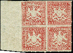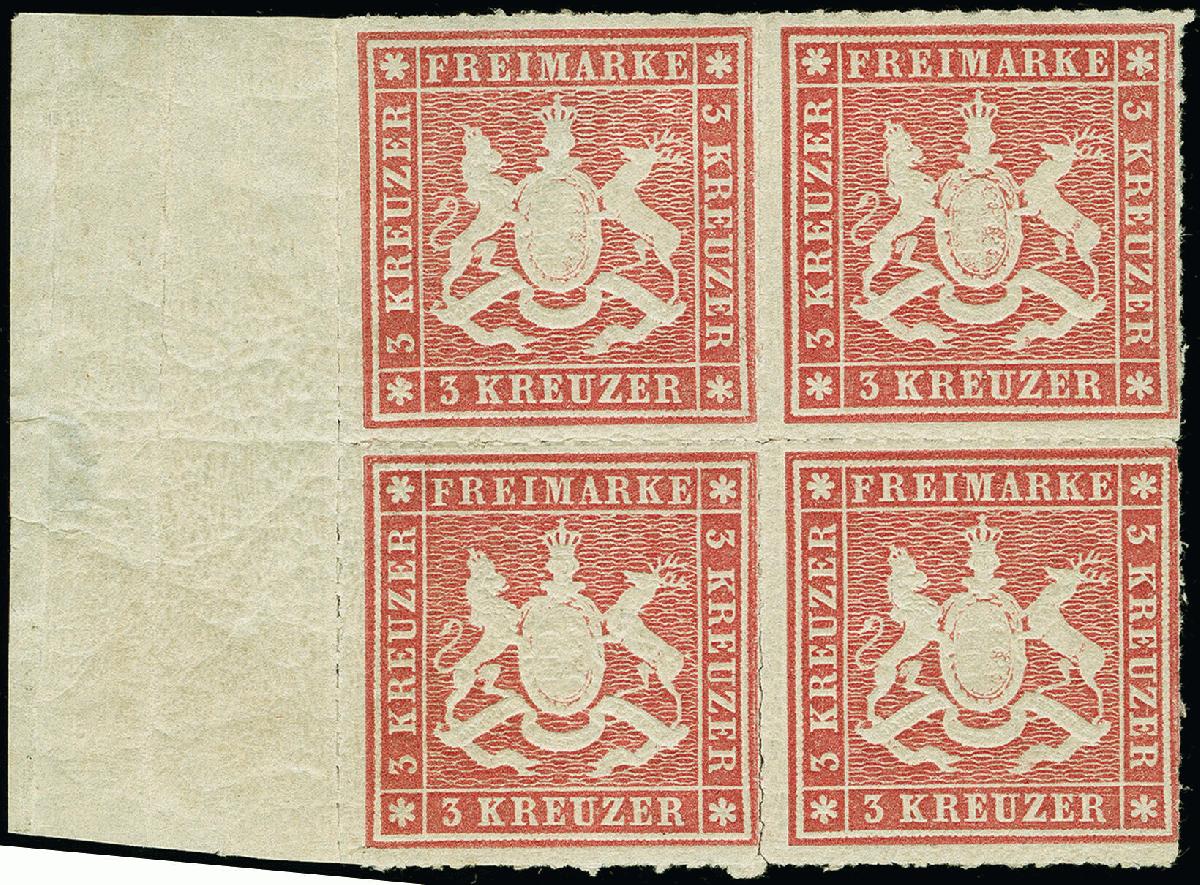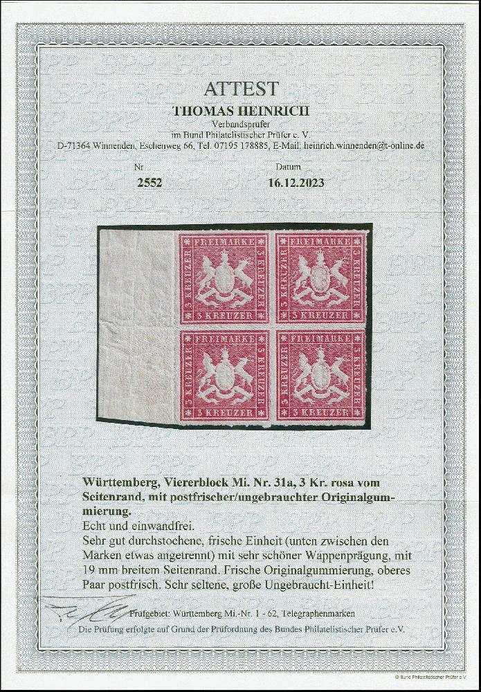| Zusatzinformationen und Suchstichworte: | 383. Auktion Heinrich Köhler 14.–15. & 18.–23. März 2024 Los 4144 Altdeutschland Württemberg 3 Kr. rosa, Viererblock mit linkem Seitenrand, farbfrisch mit schöner Wappenprägung, sehr gut durchstochen, die oberen Marken postfrisch, die unteren sauber ungebraucht, tadellos, teils gering angetrennt, eine sehr attraktive und seltene Einheit, unsigniert mit Fotoattest Heinrich BPP (2023) Ausruf 200,00 EUR |