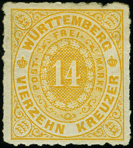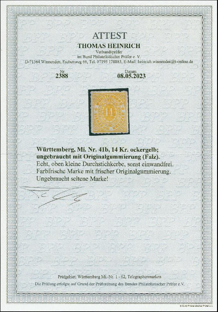 | Zusatzinformationen und Suchstichworte: | 383. Auktion Heinrich Köhler 14.–15. & 18.–23. März 2024 Los 4156 Altdeutschland Württemberg 14 Kreuzer ockergelb, farbfrisch und gut durchstochen, lediglich oben winzige Durchstichkerbe, ungebraucht mit Originalgummi. Eine seltene Marke, Fotoattest Heinrich BPP (2023) Ausruf 200,00 EUR |