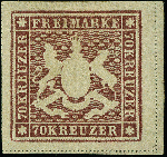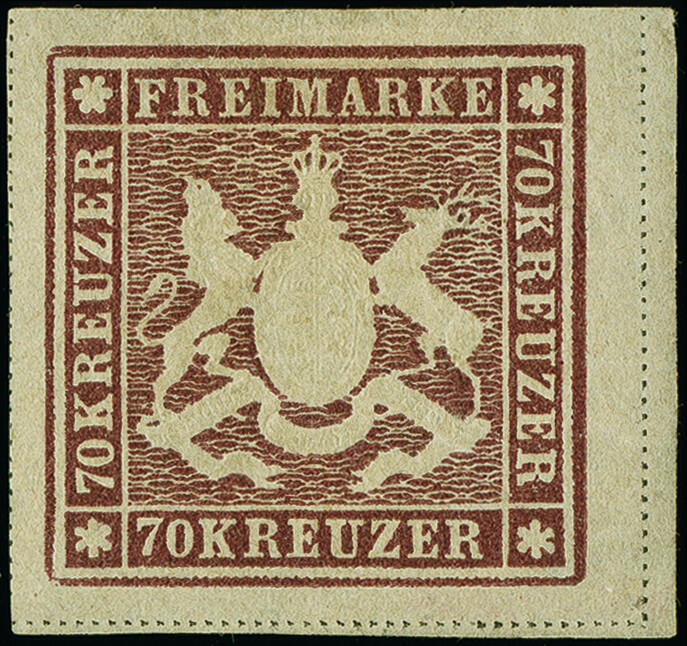 | Zusatzinformationen und Suchstichworte: | 383. Auktion Heinrich Köhler 14.–15. & 18.–23. März 2024 Los 4157 Altdeutschland Württemberg 1873, 70 Kr. braunlila, Bogenfeld 6, farbfrisch und allseits breitrandig geschnitten, mit schöner Wappenprägung, mit Trennlinien links, rechts und unten, sauber ungebraucht, tadellos Ausruf 500,00 EUR |