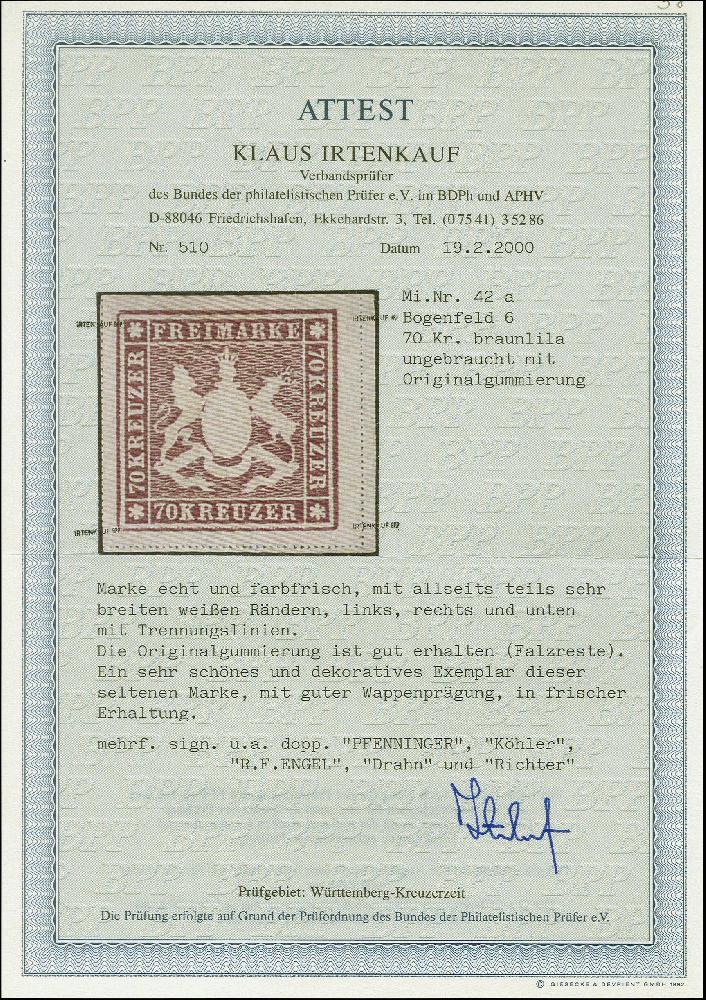 | Prüfer: | Irtenkauf, Klaus (BPP (Bund Philatelistischer Prüfer)) |