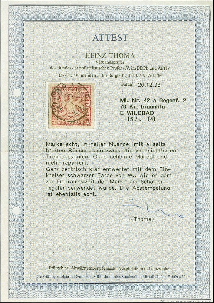 | Zusatzinformationen und Suchstichworte: | 383. Auktion Heinrich Köhler 14.–15. & 18.–23. März 2024 Los 4160 Altdeutschland Württemberg 1873, 70 Kr. violettbraun, farbfrisch, allseits breitrandig mit vollständiger Trennungslinie an zwei Seiten, sauber entwertet mit klarem Stempel "WILDBAD 15 - (4)", winziger Eckbug oben rechts ausserhalb des Markenbildes, sonst in einwandfreier und attraktiver Erhaltung, FA Thoma BPP (1998) Ausruf 1.500,00 EUR |