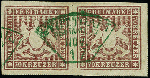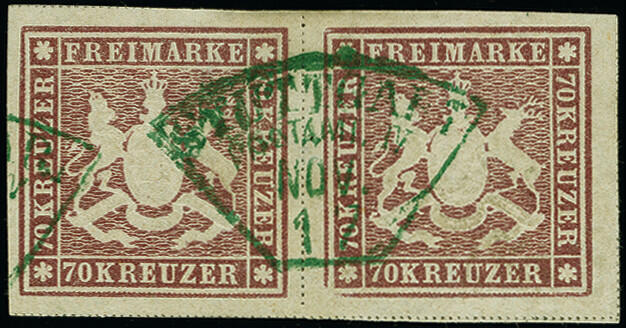 | Zusatzinformationen und Suchstichworte: | 383. Auktion Heinrich Köhler 14.–15. & 18.–23. März 2024 Los 4165 Altdeutschland Württemberg 1873, 70 Kr. braunlila, waagerechtes Paar, Bogenfelder 5-6, farbfrisch und allseits breitrandig geschnitten, große Teile der Trennlinien sichtbar, unten fast vollständig, mit guter Wappenprägung, sauber und klar mit grünen Fächerstempel "STUTTGART NOV 17" entwertet, im Markenzwischenraum winzig punkthell, sonst eine tadellose und in diesem Schnitt sehr seltene Einheit, Fotoattest Heinrich BPP (2023) Ausruf 2.500,00 EUR |