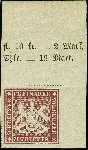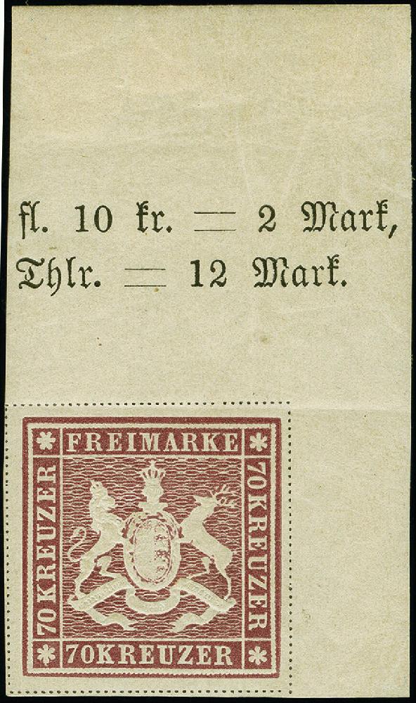 | Zusatzinformationen und Suchstichworte: | 383. Auktion Heinrich Köhler 14.–15. & 18.–23. März 2024 Los 4166 Altdeutschland Württemberg 1873, 70 Kr. rotlila, Bogenfeld 3, aus der rechten oberen Bogenecke, mit 35mm Bogenoberrand und großem Teil der Bogenrandinschrift, farbfrisch und hervorragende Wappenprägung, vollständige Trennlinien an allen Seiten, leichte Umfaltspur in der oberen Trennlinien, die Marke postfrisch, lediglich Falzreste im Rand, ein besonders attraktives Exemplar, unsigniert mit Fotoattest Heinrich BPP (2004) Ausruf 800,00 EUR |