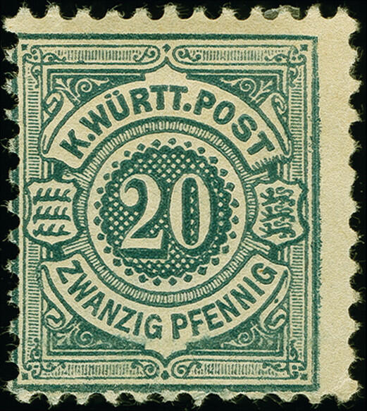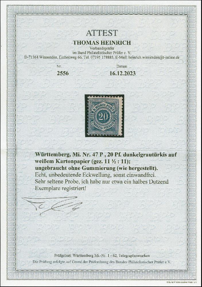| Zusatzinformationen und Suchstichworte: | 383. Auktion Heinrich Köhler 14.–15. & 18.–23. März 2024 Los 4177 Altdeutschland Württemberg 1875, 20 Pfg., gezähnter Probedruck in dunkelgrautürkis auf ungummiertem weißen Kartonpapier. Unbedeutende Eckewellung, sonst tadellos. Sehr selten. Fotoattest Heinrich BPP (2023) Ausruf 500,00 EUR |