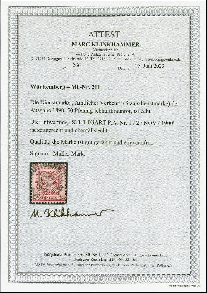 | Zusatzinformationen und Suchstichworte: | 383. Auktion Heinrich Köhler 14.–15. & 18.–23. März 2024 Los 4181 Altdeutschland Württemberg 1890, 50 Pfg. lebhaftbraunrot, farbfrisch und gut gezähnt, sauber gestempelt "STUTTGART 2 NOV 1900", tadellos, sign. Müller-Mark und Fotoattest Klinkhammer BPP (2023) Ausruf 400,00 EUR |
