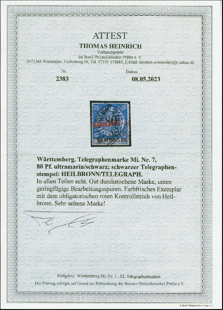| Prüfgebiet: | Altdeutschland Württemberg Telegraphenmarken |