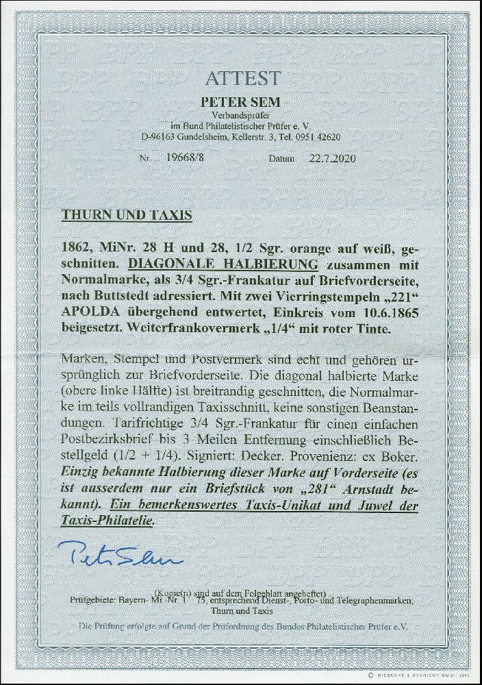 | Zusatzinformationen und Suchstichworte: | 383. Auktion Heinrich Köhler 14.–15. & 18.–23. März 2024 Los 130 Altdeutschland Thurn und Taxis 1862/64, Farbänderung ½ Silbergroschen orange diagonal halbiert, linke obere Hälfte, breit- bis überrandig zusammen mit teils leicht berührter ganzer Marke ½ Silbergroschen orange als portogerechte Frankatur auf Briefvorderseite mit nebengesetztem Einkreisstempel "APOLDA 10 6 1865" nach Buttstedt. Die halbierte ½ Silbergroschen-Marke ist hier verwendet für das Bestellgeld, das vorderseitig als Weiterfranko mit "1/4" vermerkt ist. Halbierungen von Thurn und Taxis sind allesamt allergrößte Seltenheiten; die Heinrich-Köhler-Kartei hat insgesamt nur 6 Stück registriert, dabei kein weiteres Stück mit dieser Kombination. Fotoattest Sem BPP (2020) "ein bemerkenswertes Taxis-Unikat und Juwel der Taxis-Philatelie" GEBOT |