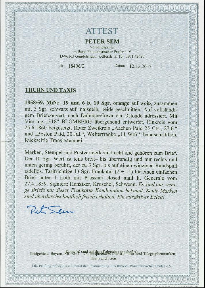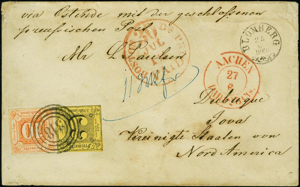 | Zusatzinformationen und Suchstichworte: | 383. Auktion Heinrich Köhler 14.–15. & 18.–23. März 2024 Los 3988 Altdeutschland Thurn und Taxis "318" auf 10 Sgr. orange in Mischfrankatur mit 1852/58, 3 Sgr. auf maisgelb, farbfrische, 10 Sgr. nur rechts unten minimal berührt, 3 Sgr. mit winzigem Randspalt, mit nebengesetztem EKr. "BLOMBERG 25 6" auf voll bezahltem Brief über die 'Prussian closed mail' nach Dubuque, Iowa. Ein sehr attraktiver Brief in sehr schöner Erhaltungsgrund mit äußerst seltene Frankatur Kombination. Fotoattest Sem BPP (2017) Ausruf 800,00 EUR |