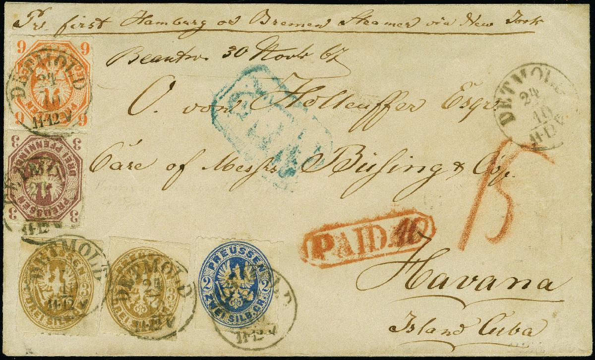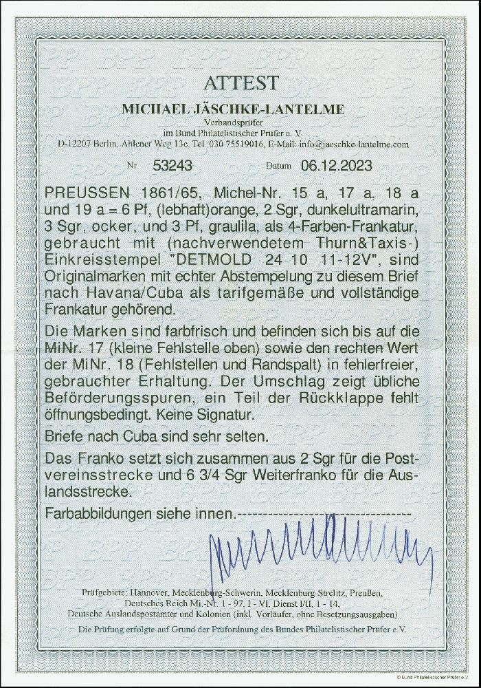 | Zusatzinformationen und Suchstichworte: | 383. Auktion Heinrich Köhler Auktionstermin 14.–15. & 18.–23. März 2024 Los 4008 Altdeutschland Preussen "DETMOLD 28 6" (1867), Taxis-EKr. auf 3 Pfg. graulila, 6 Pfg. orange und 4 Stück 2 Sgr. blau, die 6 Pfennig leicht sulfidiert, sonst alle farbfrisch und meist gut durchstochen (2 Sgr. geringer Durchstichfehler), auf Briefkuvert über Bremen nach Havanna, Kuba, mit Ankunftsstempel, vom 20.11. Eine 3 Sgr. etwas fehlerhaft aufgeklebt, Verschlusskappe großenteils fehlend, sonst für diese Destination sehr frischer Brief. Kuba ist für Preußen eine außerordentlich seltene Destination; wir haben nur 3 weitere frankierte Briefe dorthin registriert. Signiert Kruschel. Ausruf 4.000,00 EUR |