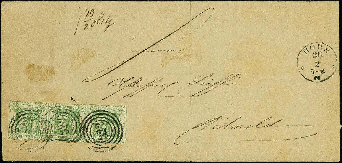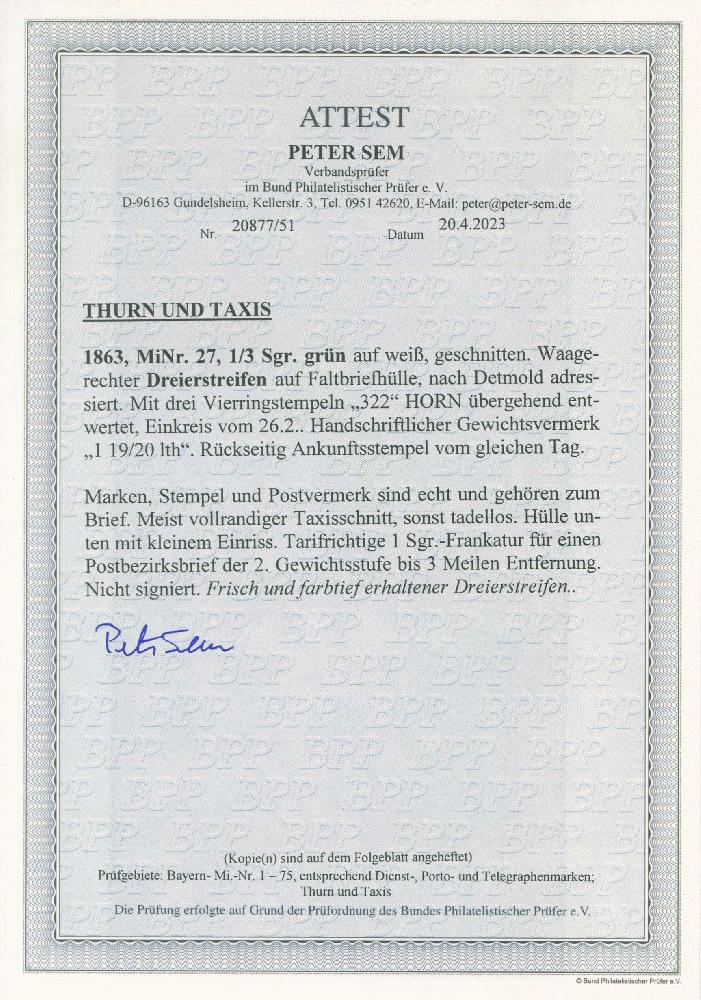 | Zusatzinformationen und Suchstichworte: | 383. Auktion Heinrich Köhler 14.–15. & 18.–23. März 2024 Los 4016 Altdeutschland Thurn und Taxis "322" auf ⅓ Sgr. grün, waagerechter Dreierstreifen, meist vollständiger Taxisschnitt, mit nebengesetztem EKr. "HORN 26 2" auf Briefhülle der 2. Gewichtsstufe im Nahverkehr nach Detmold. Die Hülle senkrecht gefaltet und vorderseitig Falzflecken, sonst einwandfrei. Fotoattest Sem BPP (2023) Ausruf 200,00 EUR |