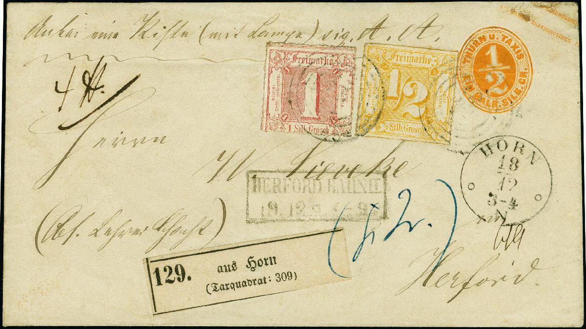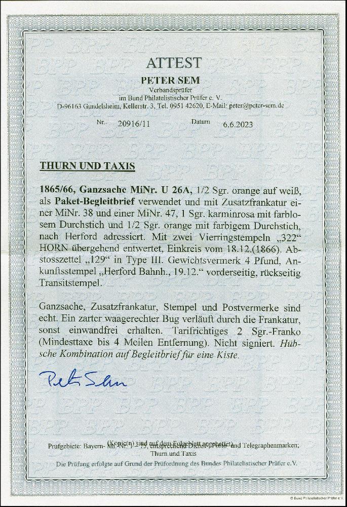 | Zusatzinformationen und Suchstichworte: | 383. Auktion Heinrich Köhler 14.–15. & 18.–23. März 2024 Los 4017 Altdeutschland Thurn und Taxis "322" auf 1 Sgr.rot, farblos durchstochen, und ½ Sgr. gelborange, farbig durchstochen, als Zufrankatut auf GSU ein halb Sgr. orange, mit klar nebengesetztem EKr. "HORN 18/12" als Paketbegleitbrief mit vorderseitigen Paketzettel, nach Herford. Unauffällige waagerechte Faltung durch die Frankatur, sonst einwandfrei. Ein seltener Fahrpost-Beleg. Fotoattest Sem BPP (2023) Ausruf 200,00 EUR |