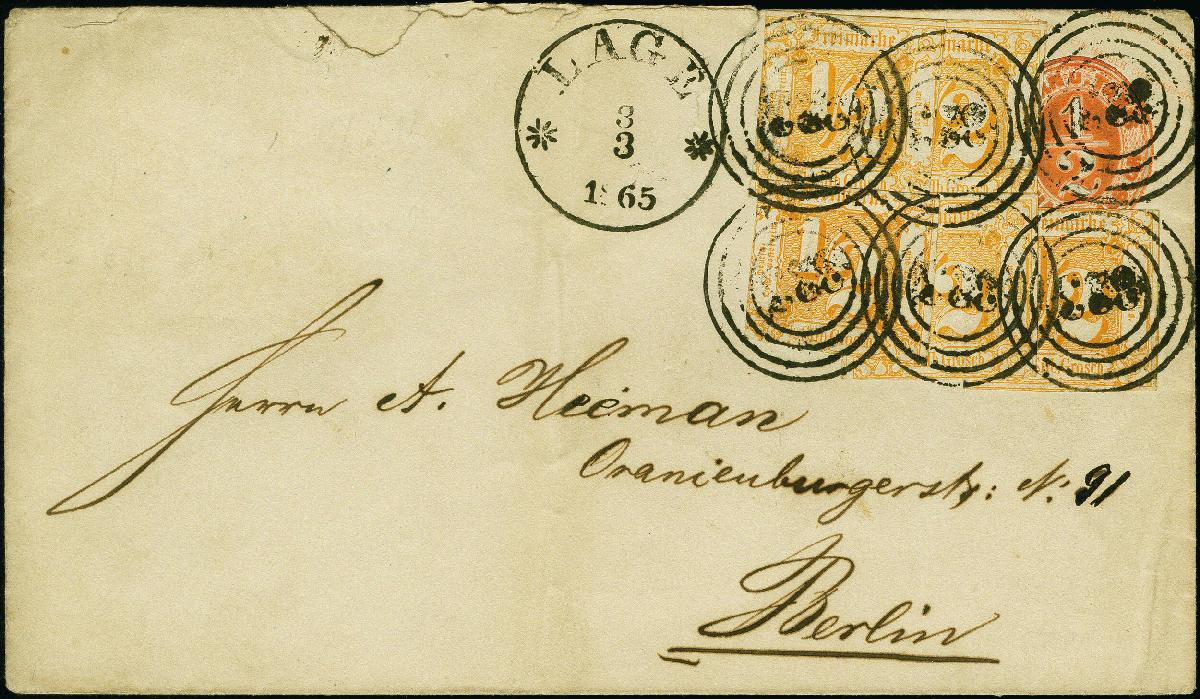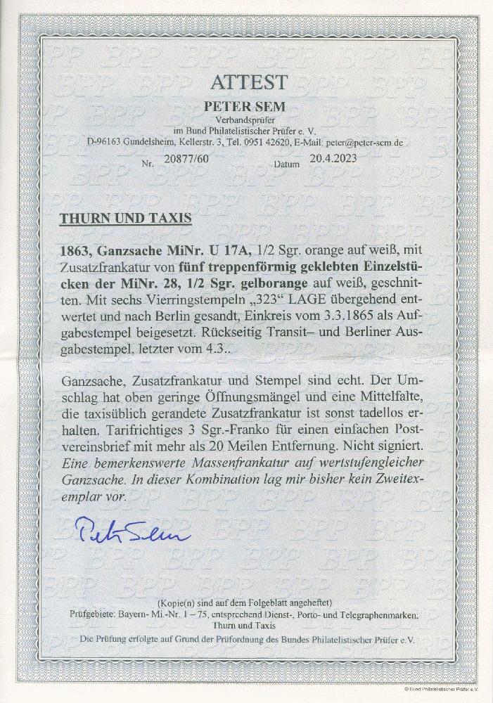 | Zusatzinformationen und Suchstichworte: | 383. Auktion Heinrich Köhler Auktionstermin 14.–15. & 18.–23. März 2024 Los 4021 Altdeutschland Thurn und Taxis "323" auf ½ Sgr. orange, 5 Einzelwerte, treppenförmig geklebt auf GSU ½ Sgr. rotorange, mit nebengesetztem EKr. "LAGE 3 3 1865", nach Berlin. Der Umschlag Ruhe gönnen geringe Öffnungsmängel und senkrechte Faltung außerhalb der Frankatur. Eine attraktive und in dieser Form einmalige Frankaturkombination. Fotoattest Sem BPP (2023) Ausruf 200,00 EUR |