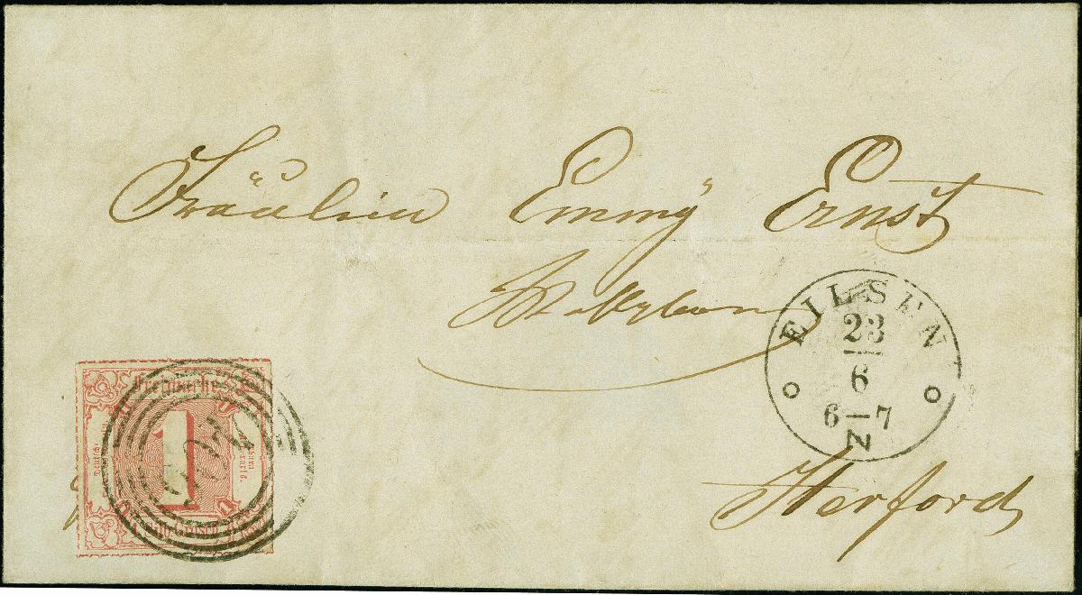 | Zusatzinformationen und Suchstichworte: | 383. Auktion Heinrich Köhler 14.–15. & 18.–23. März 2024 Los 4078 Altdeutschland Thurn und Taxis "406", sauber auf 1 Sgr. farbig durchstochen, mit klar nebengesetztem EKr. "EILSEN 23/6" (1867) auf Briefhülle mit Teil des Inhaltes, nach Herford. Schöne und einwandfreie Erhaltung. Ein sehr seltener Brief; wir haben nur 2 weitere frankierte Briefe mit dem seltenen Nummernstempel registriert. Fotoattest Sem BPP (2023) Ausruf 700,00 EUR |