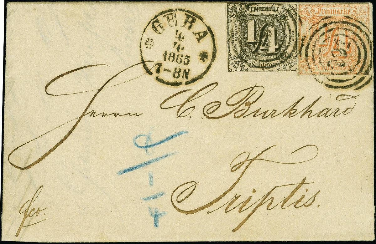 | Zusatzinformationen und Suchstichworte: | 383. Auktion Heinrich Köhler 14.–15. & 18.–23. März 2024 Los 4098 Altdeutschland Thurn und Taxis 1861, ¼ Sgr. rötlichorange in Mischfrankatur mit 1862 ¼ Sgr. schwarz, je farbfrisch und üblich berührt, mit Nummernstempel "291" und nebengesetztem EKr. "GERA 4 4 1865" auf Faltbrief nach Triptis, eine seltene wertstufengleiche Mischfrankatur der 2. und 3. Ausgabe, Fotoattest Gärtner BPP (2023) Ausruf 200,00 EUR |