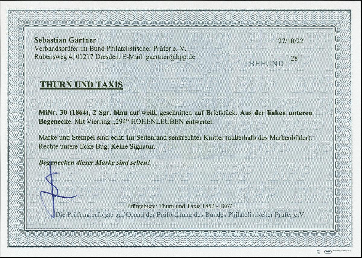 | Zusatzinformationen und Suchstichworte: | 383. Auktion Heinrich Köhler 14.–15. & 18.–23. März 2024 Los 4100 Altdeutschland Thurn und Taxis 2 Sgr. blau, breit-bis überrandige linke untere Bogenecke mit 1-2mm Bogenrändern, rechts mit Teil der Nachbarmarke, mit sauber aufgesetzter Nr. "294" HOHENLEUBEN auf Briefstück. Im Bogenrand kleiner Knitter und rechts unten unauffälliger leichte Eckbug. Fotobefund Gärtner BPP (2022) Ausruf 80,00 EUR |