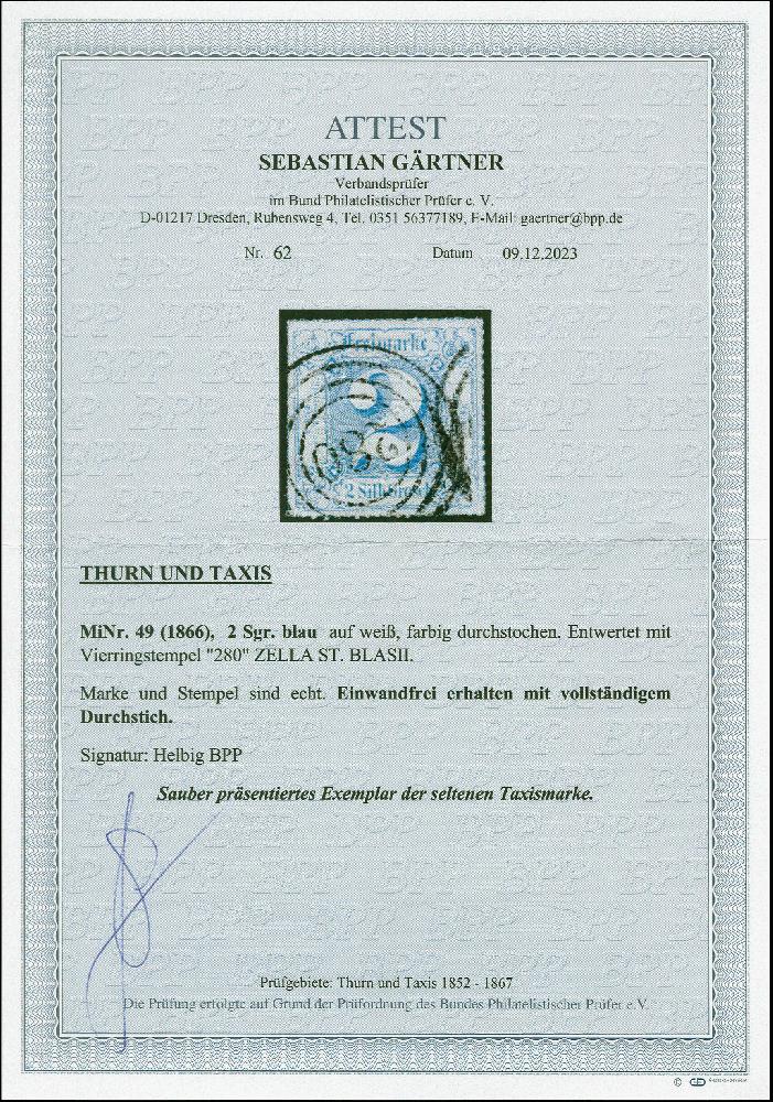 | Zusatzinformationen und Suchstichworte: | 383. Auktion Heinrich Köhler 14.–15. & 18.–23. März 2024 Los 4103 Altdeutschland Thurn und Taxis 2 Sgr. blau, farbfrisch und einwandfrei durchstochen, sauber entwertet durch Nr. 280 ZELLA ST. BLASIL Tadellos. Signiert Helbig BPP und Fotoattest Gärtner BPP (2023) Ausruf 180,00 EUR |