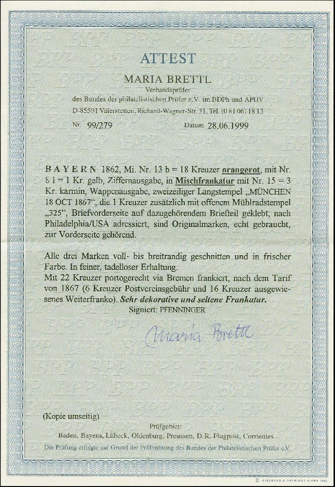 | Zusatzinformationen und Suchstichworte: | 383. Auktion Heinrich Köhler Auktionstermin 14.–15. & 18.–23. März 2024 Los 8264 Altdeutschland Bremen 18 Kreuzer orangerot und 1 Kreuzer gelb, in Mischfrankatur mit Wappen 3 Kreuzer rosa, alle farbfrisch und (noch) voll-bis breitrandig, mit Duplex-Entwertung durch oMR "325" und L2 "MÜNCHEN 18 OCT 1867" auf Briefvorderseite (auf dazugehörendes Briefteil geklebt) über Bremen (Transportiert mit der 'Cimbria' des Norddeutschen Lloyd) nach Philadelphia. Eine attraktive und mit der 'Duplex-Entwertung' seltene Mischfrankatur in sonst tadelloser Erhaltung. Signiert Pfenninger und Fotoattest Brettl BPP (1999) |