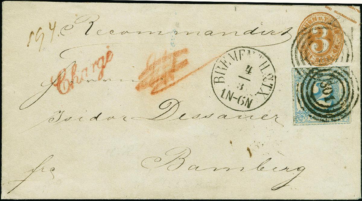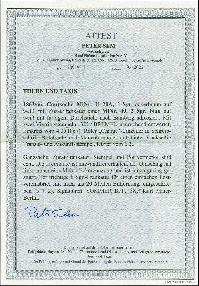 | Zusatzinformationen und Suchstichworte: | 383. Auktion Heinrich Köhler 14.–15. & 18.–23. März 2024 Los 8570 Altdeutschland Thurn und Taxis 2 Silbergroschen blau, farbfrisch und gut durchstochen, mit Nr."301" als Zufrankatur auf Ganzsachenumschlag 3 Silbergroschen ockerbraun, mit sauber nebengesetztem EKr." BREMEN TH. & TX. 4/3" als Chargé-Brief nach Bamberg. Die Marke ist tadellos, das Kuvert leichte senkrechte Faltung, die linke untere Ecke leicht ergänzt und innen gering gestützt. Ein attraktiver und mit dieser Kombination seltener Brief in den Postverein. Fotoattest Sem BPP (2023) Ausruf 500,00 EUR |