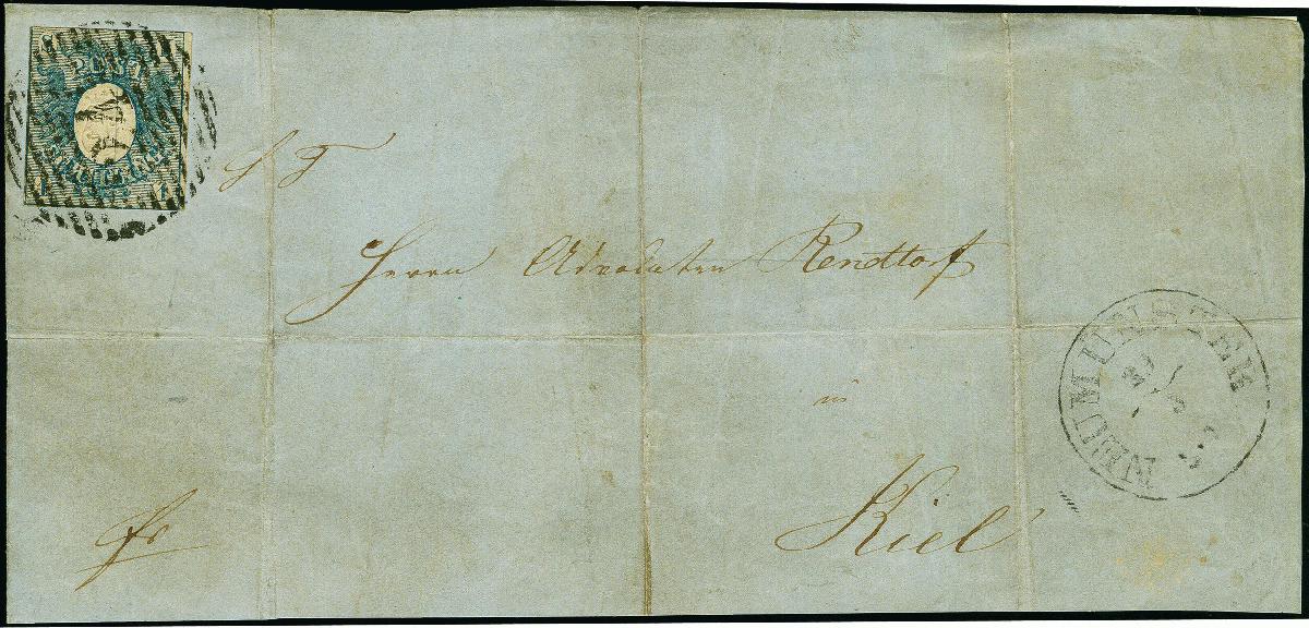 | Zusatzinformationen und Suchstichworte: | 383. Auktion Heinrich Köhler 14.–15. & 18.–23. März 2024 Los 9016 Altdeutschland Schleswig Holstein 1 Schilling blau, oben etwas angeschnitten, sonst noch voll- bis breitrandig, mit klar aufgesetztem Roststempel "24" und sauber nebengesetztem Einkreisstempel "NEUMÜNSTER 29/3" auf Briefvorderseite nach Kiel. Das Briefpapier außerhalb der Frankatur mehrfach gefaltet und etwas Patina. Eine sehr seltene Entwertung auf der 1.Ausgabe; wir haben nur noch einen Brief mit der Nr. 1 aus Neumünster registriert. Fotoattest Möller BPP (2007) Ausruf 1.000,00 EUR |
