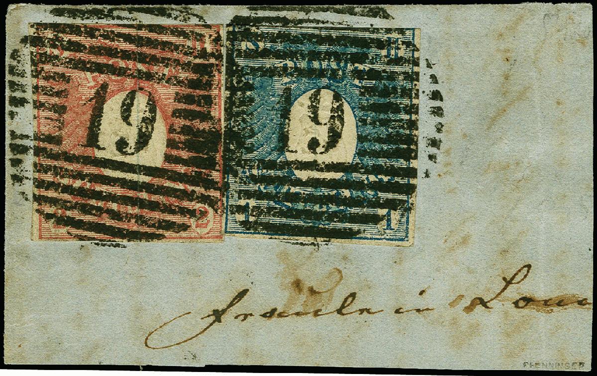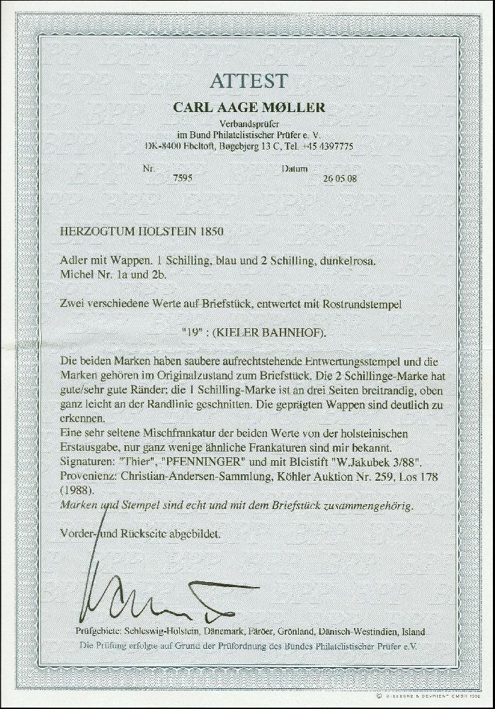 | Zusatzinformationen und Suchstichworte: | 383. Auktion Heinrich Köhler 14.–15. & 18.–23. März 2024 Los 9018 Altdeutschland Schleswig Holstein 1 Schilling blau und 2 Schilling dunkelrosa, beide sehr schön farbfrisch, die 1 Schilling oben leicht berührt, sonst beide und voll- bis meist breitrandig, mit jeweils klar aufgesetztem Roststempel "19" KIELER BAHNHOF auf Briefstück. Schöne und einwandfreie Erhaltung. Farbfrankaturen der 1. Ausgabe sind große Seltenheiten; in Kombination mit der 2 Schilling dunkelrosa haben wir nur ein weiteres Briefstück registriert. Signiert Thier, Pfenninger und Jakubek, Fotoattest Möller BPP (2008) Ausruf 4.000,00 EUR |