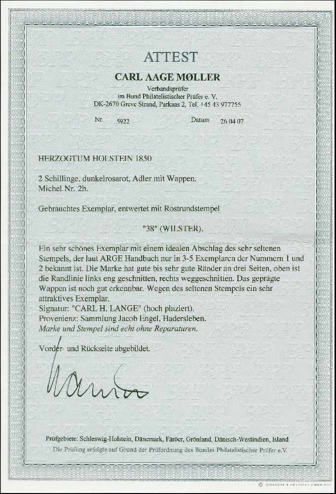 | Zusatzinformationen und Suchstichworte: | 383. Auktion Heinrich Köhler 14.–15. & 18.–23. März 2024 Los 9023 Altdeutschland Schleswig Holstein 2 Schilling dunkelrosa, farbfrisch, oben leicht berührt bzw. gering angeschnitten, unten noch voll-, sonst voll- bis breitrandig, sehr schön entwertet durch zentrisch und klar aufgesetzten Roststempel "38" WILSTER. Außerordentlich selten. Es sind nur eine Handvoll loser Stücke der 1. Ausgabe, aber kein Ganzstück mit dieser Entwertung bekannt. Signiert Carl H. Lange, Fotoattest Moeller BPP (2007) Ausruf 1.500,00 EUR |