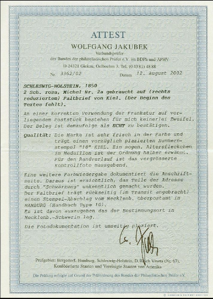 | Zusatzinformationen und Suchstichworte: | 383. Auktion Heinrich Köhler 14.–15. & 18.–23. März 2024 Los 9024 Altdeutschland Schleswig Holstein 2 Schilling rosa, links unten leicht berührt, sonst voll- bis breitrandig und farbfrisch, mit klar aufgesetztem Roststempel "18" und nebengesetztem dänischen Kreisstempel "KIEL 2/2" auf Faltbrief (eine Seitenklappe fehlend, eine verkürzt) nach Gersdorf bei Kröpelin in Mecklenburg-Schwerin. Der Brief ist portogerecht frankiert bis Hamburg, für die verbleibende Strecke wurden vom Empfänger "3" Schilling eingezogen. Die Marke ist bis auf einen kleinen Eckknitter und ein winziges Altersfleckchen einwandfrei, Teile der Adresse wurden geschwärzt. Ein postgeschichtlich sehr interessantes Stück; es sind nur ganz wenige Auslandsbriefe der 1. Ausgabe registriert. Fotoatteste Jakubek BPP (2002) und Moeller BPP (2006) Ausruf 3.000,000 EUR |