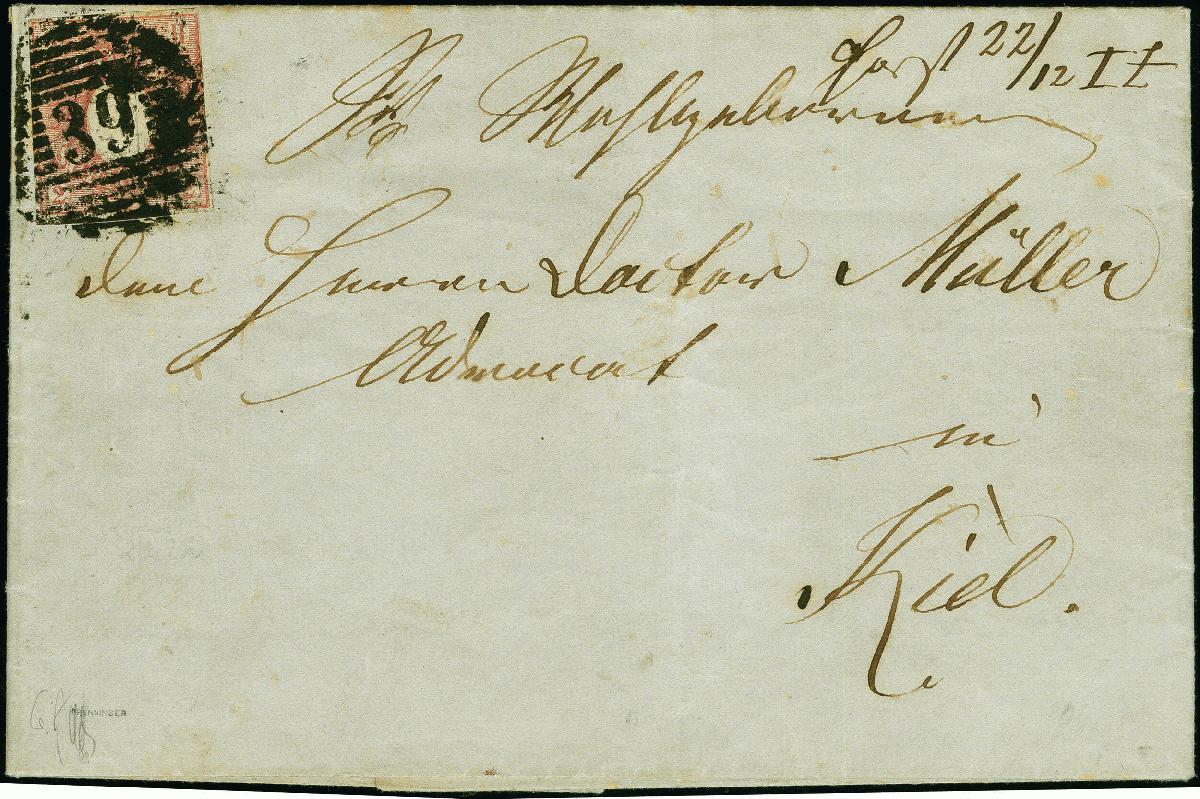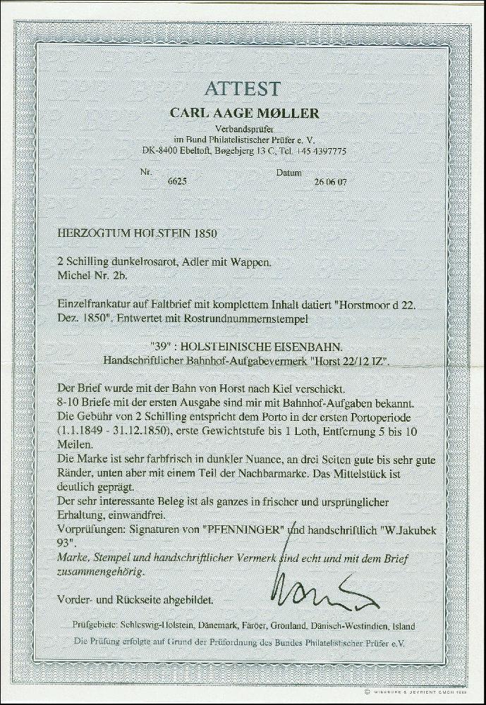| Zusatzinformationen und Suchstichworte: | 383. Auktion Heinrich Köhler 14.–15. & 18.–23. März 2024 Los 9025 Altdeutschland Schleswig Holstein 2 Schilling dunkelrosa, sehr schön farbfrisch und allseits voll- bis breitrandig, unten mit kleinem Teil der Nachbarmarke, mit sauber aufgesetztem Roststempel "39" auf komplettem Faltbrief aus Horstmoor, mit handschriftlichem Aufgabevermerk "Horst 22/12 I Z" (1850) nach Kiel. Sehr schöne ursprüngliche und einwandfreie Erhaltung. Ein attraktiver und außerordentlich seltener Bahnpost-Brief. Signiert Pfenninger und Jakubek, Fotoattest Möller BPP (2007) Ausruf 8.000,00 EUR |