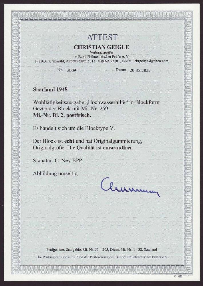 | Zusatzinformationen und Suchstichworte: | Christian E. Geigle Briefmarkenfachhandel Los 0004046805 Saarland 1948, Kleiner Hochwasserblock, postfrischer Luxusblock, Blocktype V, FA Geigle "einwandfrei". Festpreis 275,00 EUR |