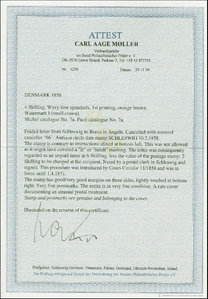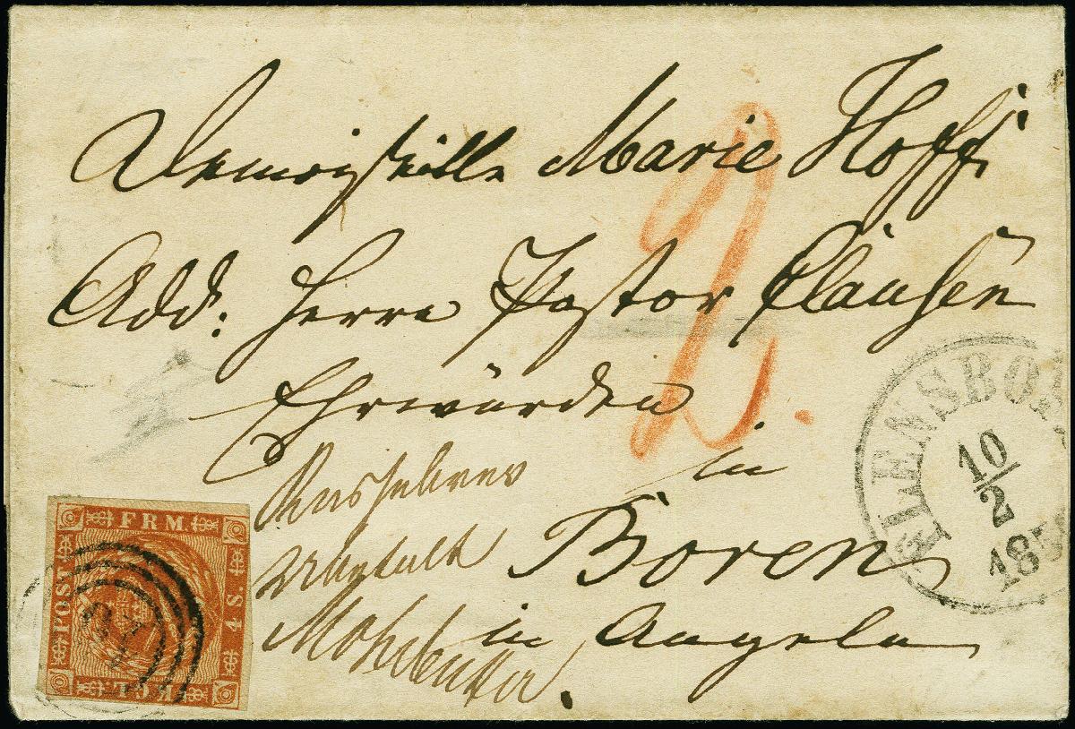 | Zusatzinformationen und Suchstichworte: | 383. Auktion Heinrich Köhler 14.–15. & 18.–23. März 2024 Los 9046 Altdeutschland Schleswig Holstein "16" FLENSBURG auf 1858, 4 Skilink braun, kurz berührt, mit sauber nebengesetztem Einkreisstempel "FLENSBORG 10/2 1858" auf kleiner Briefhülle nach Boren in Angeln. Da die Marke vorschriftswidrig links unten statt rechts oben geklebt war, wurde die Frankatur nicht anerkannt und mit "2" Skilling nachtaxiert; entsprechender Vermerk des Postbeamten neben der Marke. Ein interessanter und seltener Brief. Fotoattest Möller BPP (2004) Ausruf 150,00 EUR |