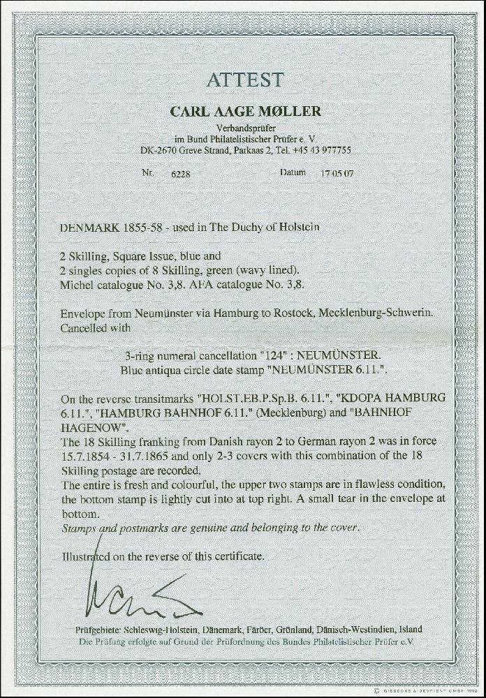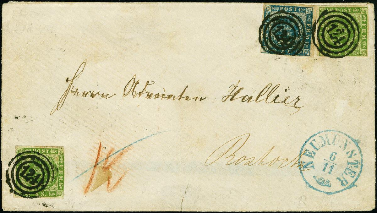 | Zusatzinformationen und Suchstichworte: | 383. Auktion Heinrich Köhler 14.–15. & 18.–23. März 2024 Los 9072 Altdeutschland Schleswig Holstein "124" NEUMÜNSTER sauber auf 2 Skilling blau und 2 Einzelwerten 1858, 8 Skilling grün, ungewöhnlicherweise rechts oben und links unten verklebt, auf Briefkuvert mit sauber nebengesetztem blauem Posthorn-Stempel "NEUMÜNSTER 6/11" nach Rostock. Eine Marke einseitig leicht berührt, das Kuvert rückseitig kleine Fehlstelle und kleiner Einriß unten, sonst einwandfreie und schöne Erhaltung. Eine außerordentlich seltene Frankaturkombination für das 18 Skilling-Porto aus dem 2. dänischen- in den 2. deutschen Rayon. Fotoattest Möller BPP (2007) Ausruf 1.000,00 EUR |