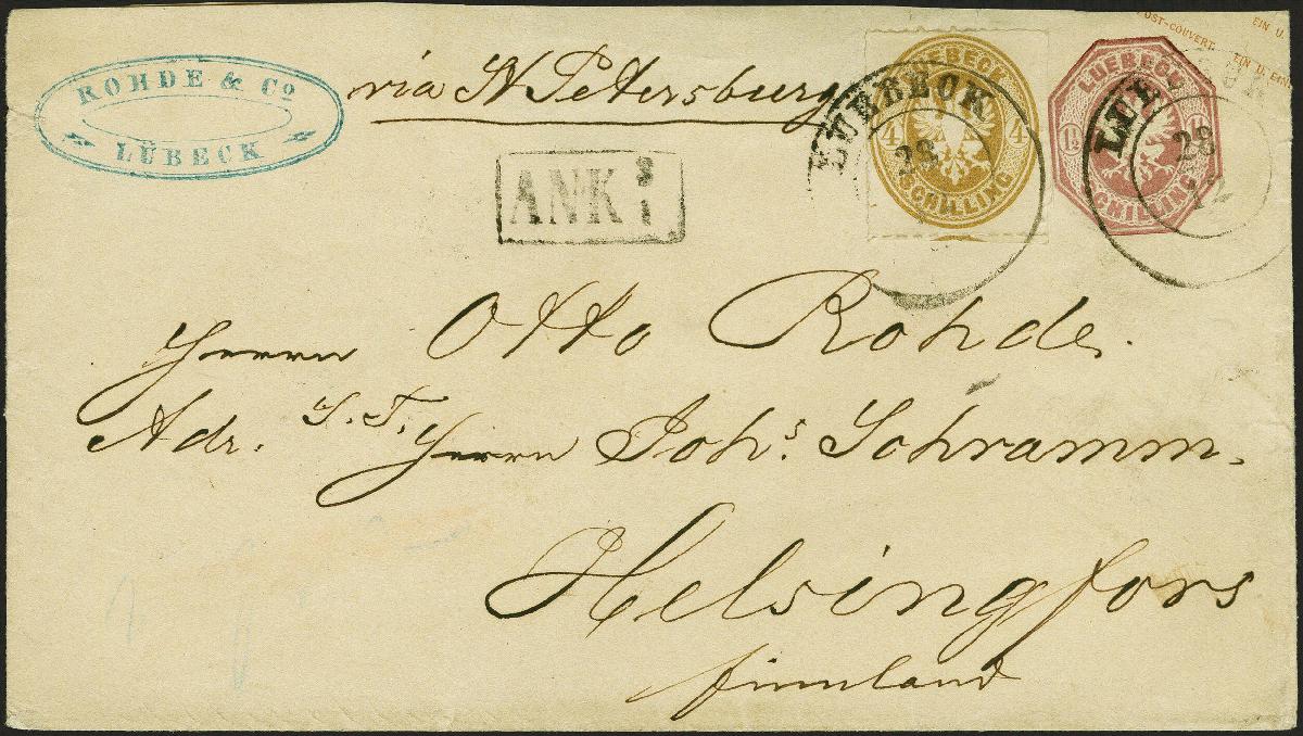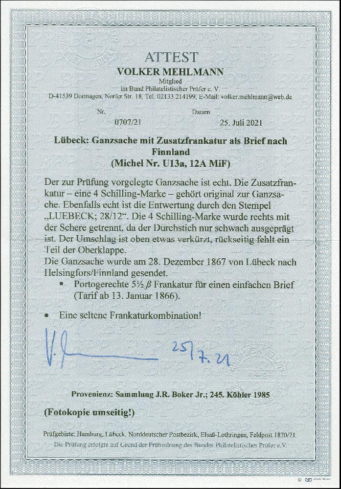 | Zusatzinformationen und Suchstichworte: | 383. Auktion Heinrich Köhler Auktionstermin 14.–15. & 18.–23. März 2024 Los 105 Altdeutschland Lübeck Umschlag 1½ Schilling rosa mit Zufrankatur 1863, 4 Schilling mittelolivbraun, rechts Scherentrennung außerhalb eines nur schwach gekommenen Durchstiches, sonst einwandfrei, mit sauber aufgesetztem Doppelkreisstempel "LUEBECK 28/12" (1867) nach Helsingfors in Finnland mit vorderseitigem "ANK3 1". Das Kuvert durch Öffnung minimal verkürzt, ein Teil der rückseitigen Verschlußklappe fehlend. Ein attraktiver Auslandsbrief; die Heinrich Köhler-Kartei hat keine weitere derartige Kombination registriert. Fotoattest Mehlmann BPP (2021) GEBOT |