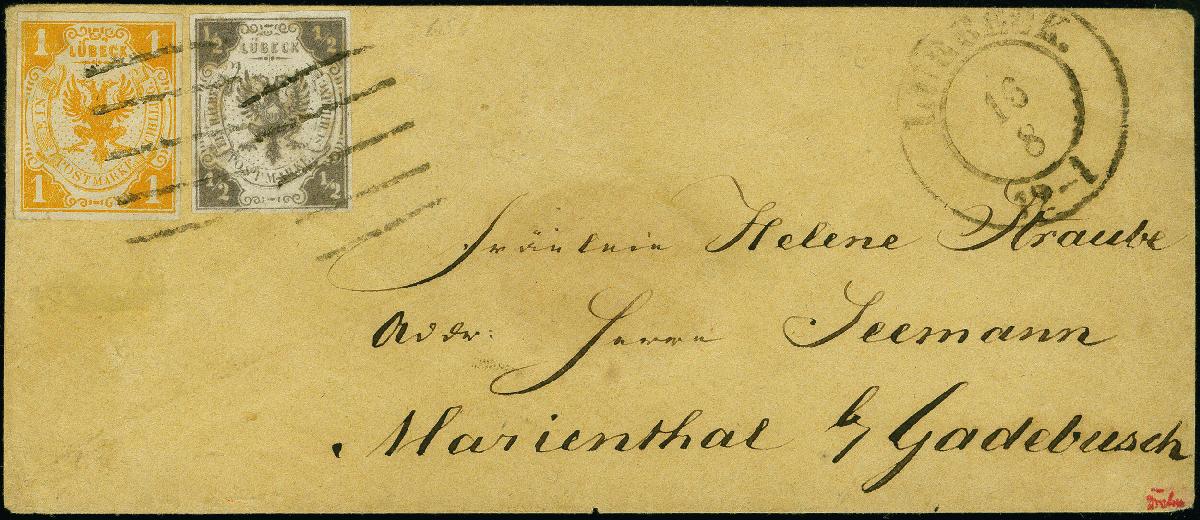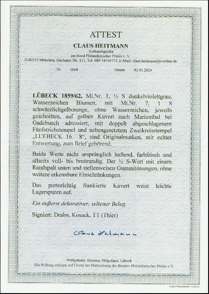 | Zusatzinformationen und Suchstichworte: | 383. Auktion Heinrich Köhler Auktionstermin 14.–15. & 18.–23. März 2024 Los 3906 Altdeutschland Lübeck 1859, ½ Schilling dunkelgrauviolett in Mischfrankatur mit 1862, 1 Schilling schwärzlichgelborange, beide farbfrisch und allseits voll- bis breitrandig geschnitten, mit sauber aufgesetzten Strichstempeln und klar nebengesetztem DKr. "LUEBECK. 165 8 12-1" auf kleinem Briefkuvert nach Gadebusch in Mecklenburg. Die Marken haften nicht ursprünglich, der ½ Sch. Wert unten kleiner, unauffälliger Randspalt, die Randlinie kaum berührend, ansonsten in tadelloser und außerordentlich attraktiver Erhaltung, sign. Drahn sowie Fotoattest Heitmann BPP (2024) Ausruf 5.000,00 EUR |