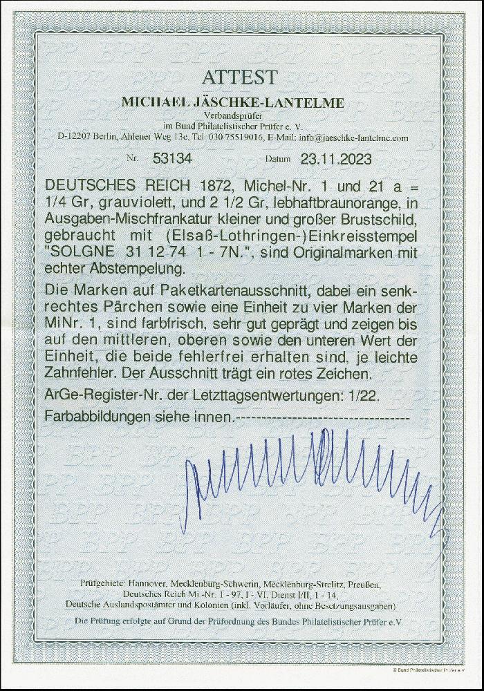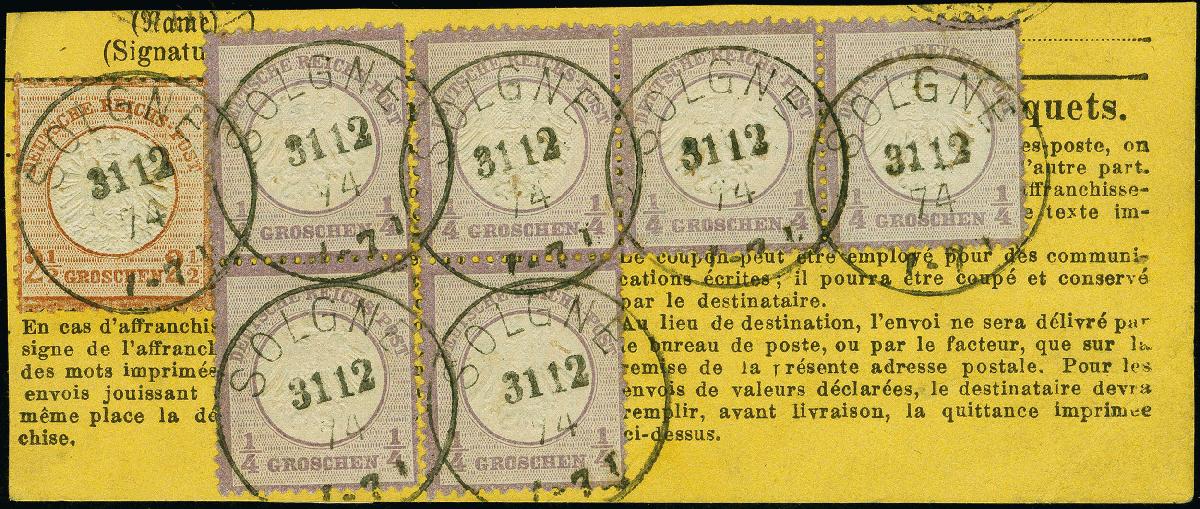 | Zusatzinformationen und Suchstichworte: | 383. Auktion Heinrich Köhler 14.–15. & 18.–23. März 2024 Los 2110 Deutsches Reich, 1872 Kleiner Brustschild 1872, Kleiner Schild ¼ Gr. grauviolett im senkrechten Paar sowie unregelmäßigen Viererblock in Mischfrankatur mit Großer Schild 2½ Gr. lebhaftbraunorange, alle farbfrisch und sehr gut geprägt, sauber mit Letzttagsentwertung "SOLGNE 31 12 74" auf Paketkartenausschnitt, einige unbedeutend verkürzte Zähne, insgesamt ein höchst dekoratives und ungewöhnliches Briefstück mit Letzttagsentwertung auf der Nummer 1 Ausruf 200,00 EUR |