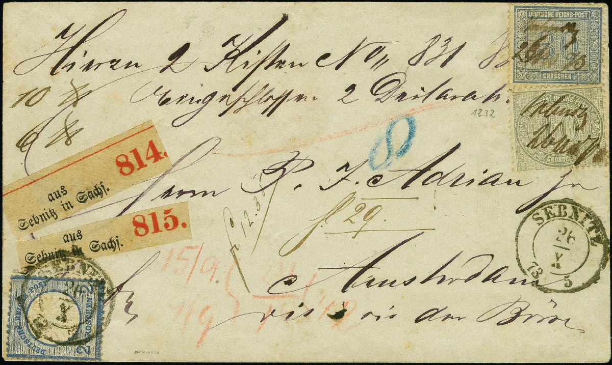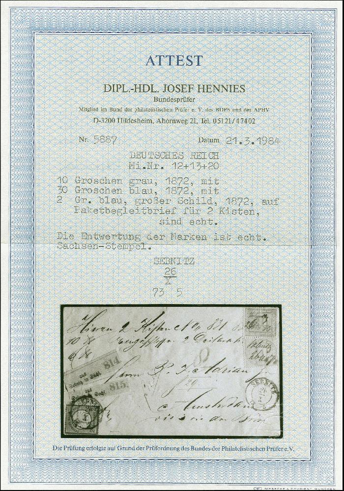 | Zusatzinformationen und Suchstichworte: | 383. Auktion Heinrich Köhler 14.–15. & 18.–23. März 2024 Los 2127 Deutsches Reich 1872, Innendienst 10 Gr. grau und 20 Gr. blau mit Zufrankatur Großer Schild 2 Gr. blau von Sebnitz mit Sachsen-Ekr. "SEBNITZ 26/X 73 5" auf Marke sowie einmal nebengesetzt auf Paketbegleitbrief über zwei Kisten nach Amsterdam, Zähnungsmängel durch randnahe Klebung sowie 30 Pfg. Wert mit Bug, Altersspuren, sonst tadellos, signiert Pfenniger sowie Fotoattest Hennies BPP Ausruf 100,00 EUR |