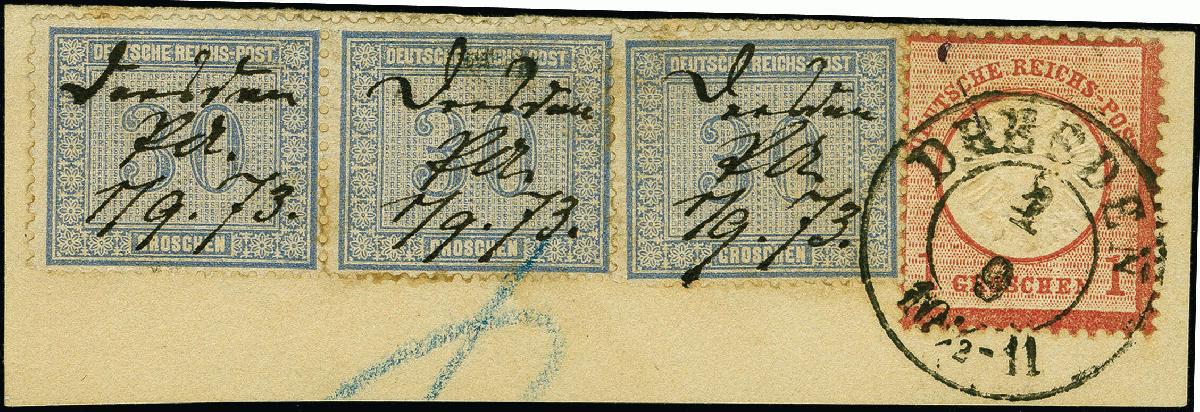 | Zusatzinformationen und Suchstichworte: | 383. Auktion Heinrich Köhler 14.–15. & 18.–23. März 2024 Los 2128 Deutsches Reich, 1872 Kleiner Brustschild Ziffern 30 Gr. blau, waagerechte Paar und Einzelwert zusammen mit Großer Schild 1 Gr. karmin mit handschriftlicher Entwertung bzw. DKr. "DRESDEN 1 9" auf Briefstück, der Einzelwert 30 Gr. zwei unauffällig ergänzte Zähne, kleine nur im UV sichtbare Flecken, eine ansonsten tadellose und attraktive Frankatur, Fotoattest Jäschke-L. BPP (2023) Ausruf 300,00 EUR |