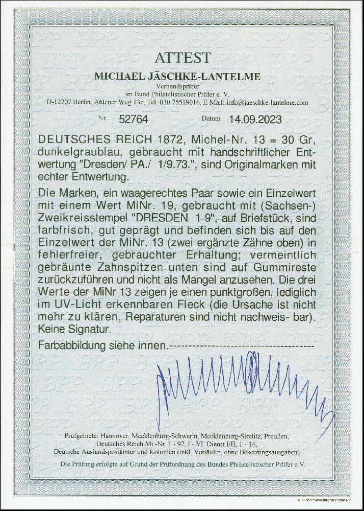 | Prüfer: | Jäschke-Lantelme, Michael (BPP (Bund Philatelistischer Prüfer)) |