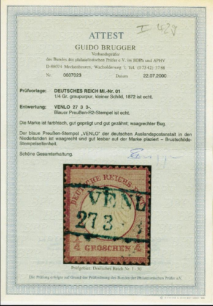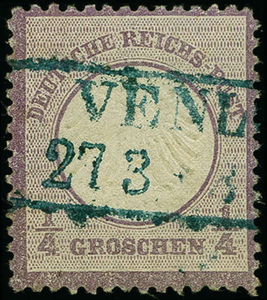 | Zusatzinformationen und Suchstichworte: | 383. Auktion Heinrich Köhler 14.–15. & 18.–23. März 2024 Los 6608 Deutsches Reich, 1872 Kleiner Brustschild ¼ Groschen graupurpur, farbfrisch und gut gezähnt (waagerechter Bug) mit blauem Rahmenstempel "VENL(O) 27.3." in optisch guter Gesamterhaltung. Dekorative und auf dieser Wertstufe seltene Entwertung von der deutschen Auslandspostanstalt in den Niederlanden, Fotoatteste Sommer BPP (1997) und Brugger BPP (2000) Ausruf 250,00 EUR |