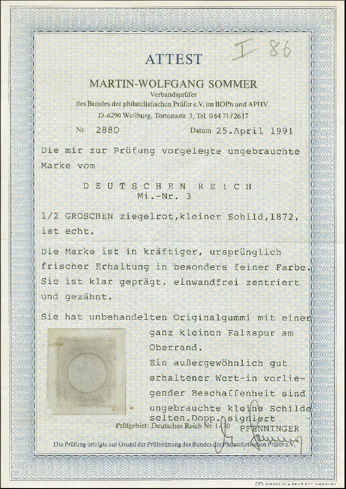 | Zusatzinformationen und Suchstichworte: | 383. Auktion Heinrich Köhler 14.–15. & 18.–23. März 2024 Los 6626 Deutsches Reich, 1872 Kleiner Brustschild ½ Groschen ziegelrot, farbfrisch, klar geprägt, sehr gut zentriert und gut gezähnt, ungebraucht, in einwandfreier Erhaltung, doppelt signiert Pfenninger und Fotoattest Sommer BPP (1991) Ausruf 300,00 EUR |