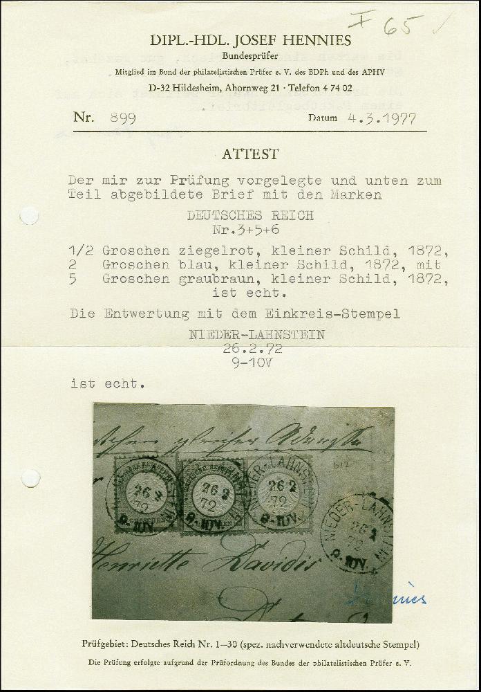 | Zusatzinformationen und Suchstichworte: | 383. Auktion Heinrich Köhler 14.–15. & 18.–23. März 2024 Los 6637 Deutsches Reich, 1872 Kleiner Brustschild ½ Groschen ziegelrot, 2 Groschen blau und 5 Groschen ockerbraun je mit klarem EKr. "NIEDER-LAHNSTEIN 26.3.72" auf Paketbegleit-Briefkuvert über 9 Pfund 430 g an die Kochbuchautorin Henriette Davidis in Dortmund mit handschriftlichem Ankunftsvermerk. Die farbfrischen Marken sind sehr gut geprägt, gut gezähnt und in einwandfreier Erhaltung, der Umschlag mit kleinen Randflecken, eine dekorative Dreifarben-Frankatur mit falsch taxiertem und frankiertem Porto für ein Paket über 10 bis 11 Pfund, Fotoattest Hennies BPP (1977) Ausruf 200,00 EUR |