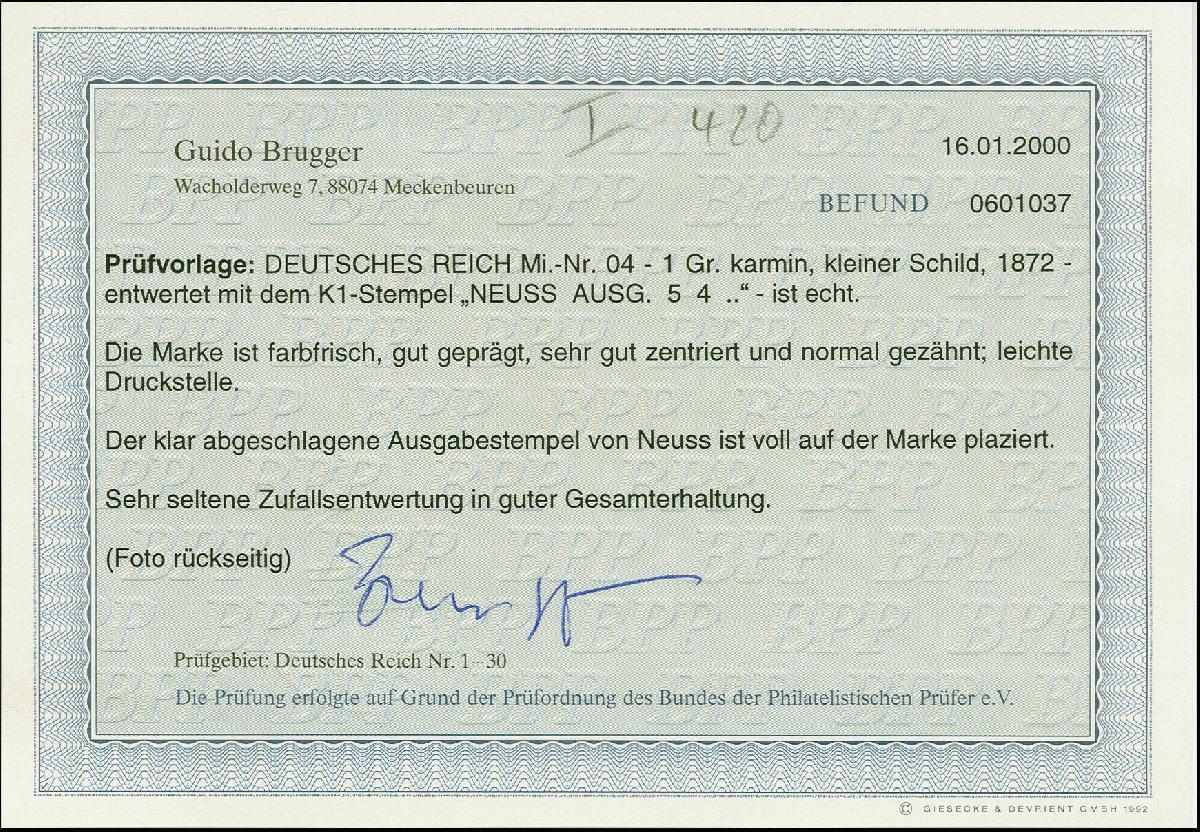 | Zusatzinformationen und Suchstichworte: | 383. Auktion Heinrich Köhler 14.–15. & 18.–23. März 2024 Los 6640 Deutsches Reich, 1872 Kleiner Brustschild 1 Groschen karmin mit klarem EKr. "NEUSS AUSG. 5.4...", die Marke mit leichter Druckstelle, sonst in einwandfreier Erhaltung, seltene Zufallsentwertung, Fotobefund Brugger BPP (2000) Ausruf 100,00 EUR |