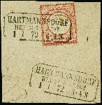 | Zusatzinformationen und Suchstichworte: | 383. Auktion Heinrich Köhler 14.–15. & 18.–23. März 2024 Los 6641 Deutsches Reich, 1872 Kleiner Brustschild 1 Groschen karmin mit Rahmenstempel "HARTMANNSDORF BEI BURGSTÄDT 1.1.72" auf größerem Briefstück. Die Marke sehr gut geprägt, sehr gut gezähnt und bis auf eine leichte Tönung im Prägefeld in einwandfreier Erhaltung, dekorative Entwertung vom Ersttag, Fotoattest Krug BPP (1997) Ausruf 200,00 EUR |