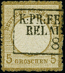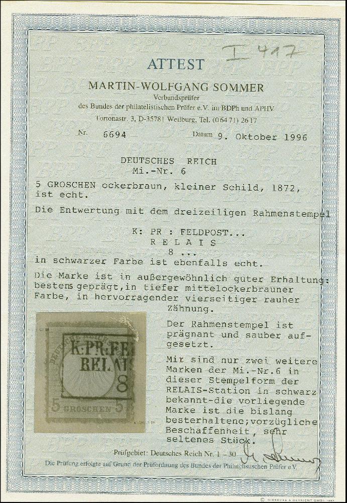 | Zusatzinformationen und Suchstichworte: | 383. Auktion Heinrich Köhler 14.–15. & 18.–23. März 2024 Los 6672 Deutsches Reich, 1872 Kleiner Brustschild 5 Groschen ockerbraun mit Feldpost-Stempel "K.PR.FE(LDPOST) RELAIS...8...", allseits raue Zähnung, in einwandfreier Erhaltung. Eine auf dieser Marke recht seltene Entwertung, Fotoattest Sommer BPP (1996) Ausruf 100,00 EUR |