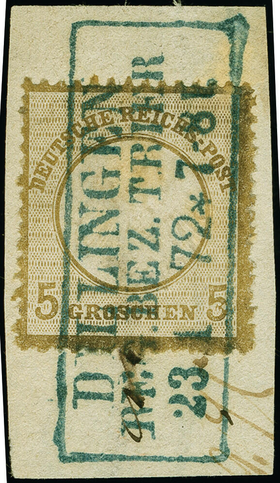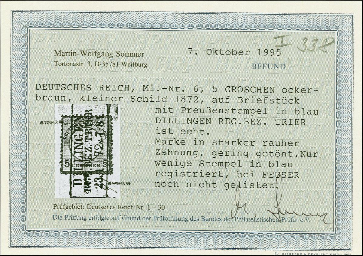 | Zusatzinformationen und Suchstichworte: | 383. Auktion Heinrich Köhler 14.–15. & 18.–23. März 2024 Los 6673 Deutsches Reich, 1872 Kleiner Brustschild 5 Groschen ockerbraun mit Plattenfehler "heller kreisförmiger Fleck im Bogen der rechten Wertziffer 5", allseits raue Zähnung mit blauem Rahmenstempel "DILLINGEN REG.BEZ. TRIER 23.1.72" auf Briefstück, leichte Patina, sonst in guter Gesamterhaltung, nicht häufige blaue Entwertung, Fotobefund Sommer BPP (1995) für Normalmarke Ausruf 100,00 EUR |