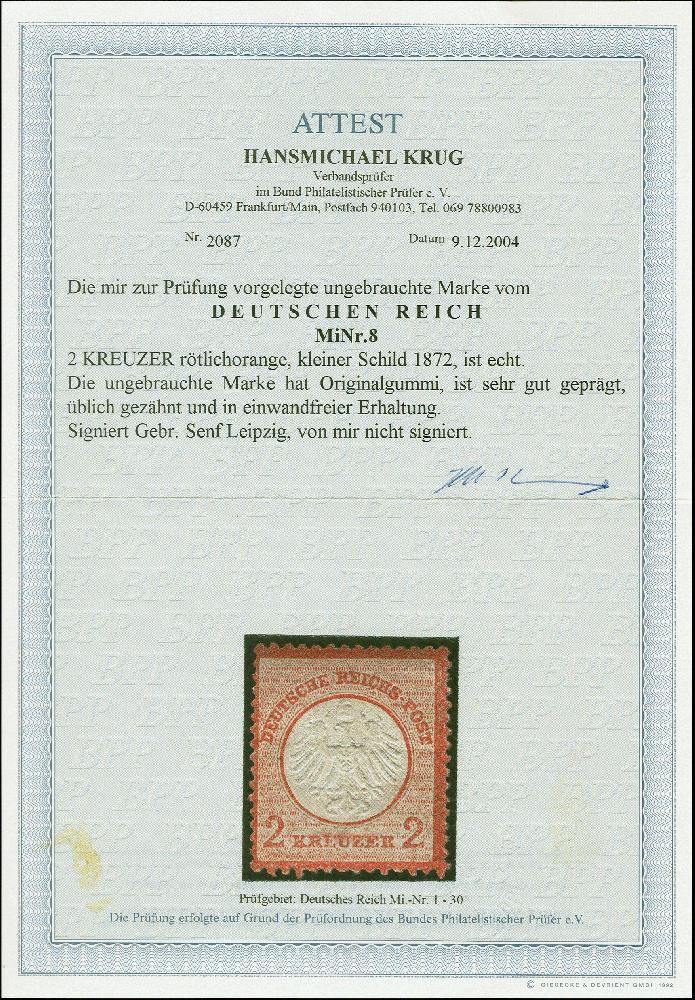 | Zusatzinformationen und Suchstichworte: | 383. Auktion Heinrich Köhler 14.–15. & 18.–23. März 2024 Los 7001 Deutsches Reich, 1872 Kleiner Brustschild 1872, 2 Kreuzer rötlichorange, ungebraucht mit üblicher Zähnung in einwandfreier Erhaltung, signiert Gebr. Senf und Fotoattest Krug BPP (2004) Ausruf 120,00 EUR |
