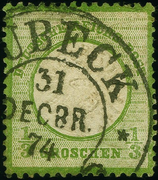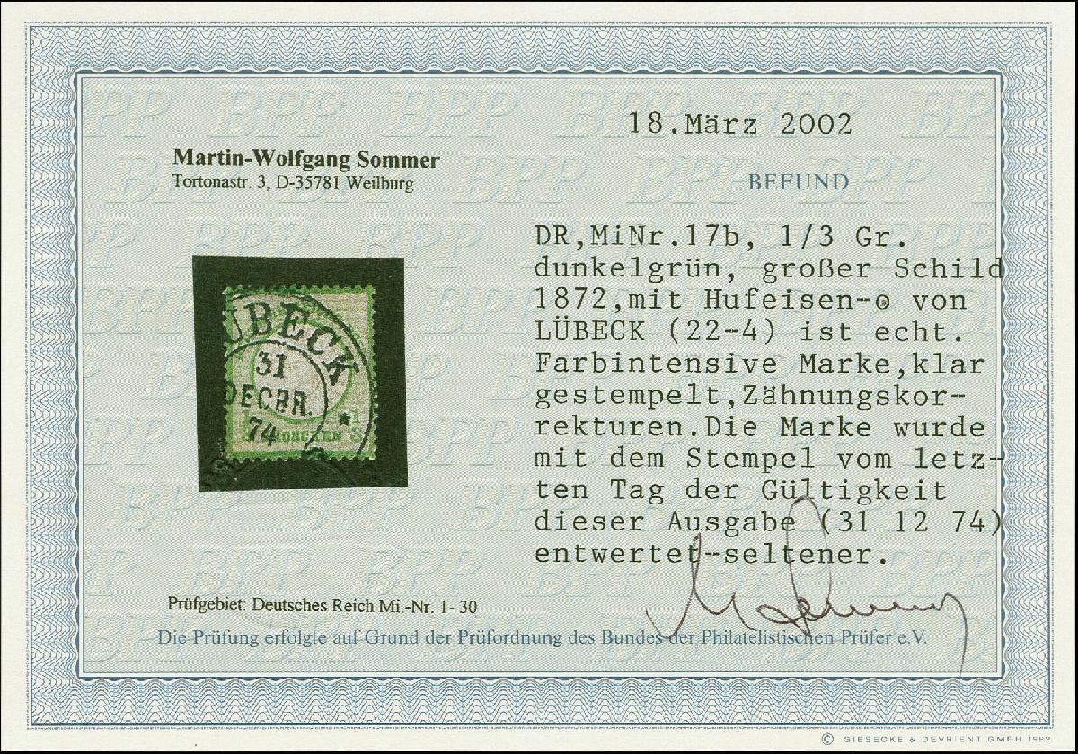 | Zusatzinformationen und Suchstichworte: | 383. Auktion Heinrich Köhler 14.–15. & 18.–23. März 2024 Los 2130 Deutsches Reich, 1872 Grosser Brustschild 1872, ⅓ Gr. dunkelgrün mit Hufeisenstempel "LÜBECK 31.DECBR.74" (Spalink 22-4) vom letzten Tag der Gültigkeit, die Marke oben mit Bügen und nachgezähnt, optisch feines Exemplar vom LETZTTAG, Fotobefund Sommer BPP (2002) Ausruf 80,00 EUR |