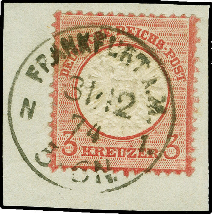 | Zusatzinformationen und Suchstichworte: | 383. Auktion Heinrich Köhler 14.–15. & 18.–23. März 2024 Los 2137 Deutsches Reich, 1872 Grosser Brustschild 3 Kr. karmin im kleinen Format L15 mit klarem EKr. "FRANKFURT A.M. N1 31.12.74" auf Briefstück in einwandfreier Erhaltung, sehr dekoratives Exemplar mit klarem Stempel vom LETZTTAG für die Kreuzer-Marken, Fotoattest Sommer BPP (2001) Ausruf 150,00 EUR |