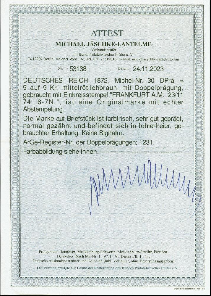 | Prüfer: | Jäschke-Lantelme, Michael (BPP (Bund Philatelistischer Prüfer)) |